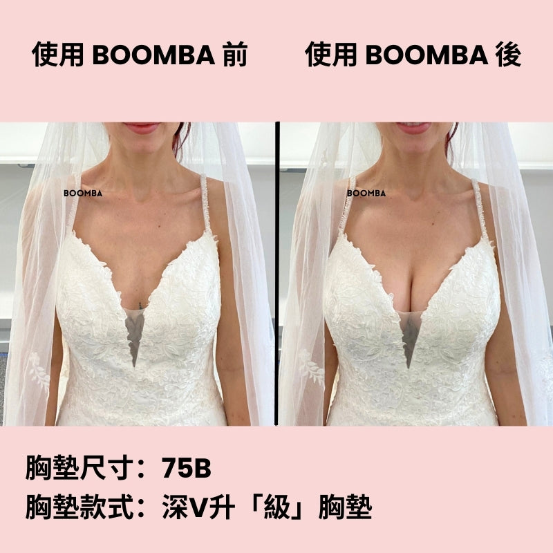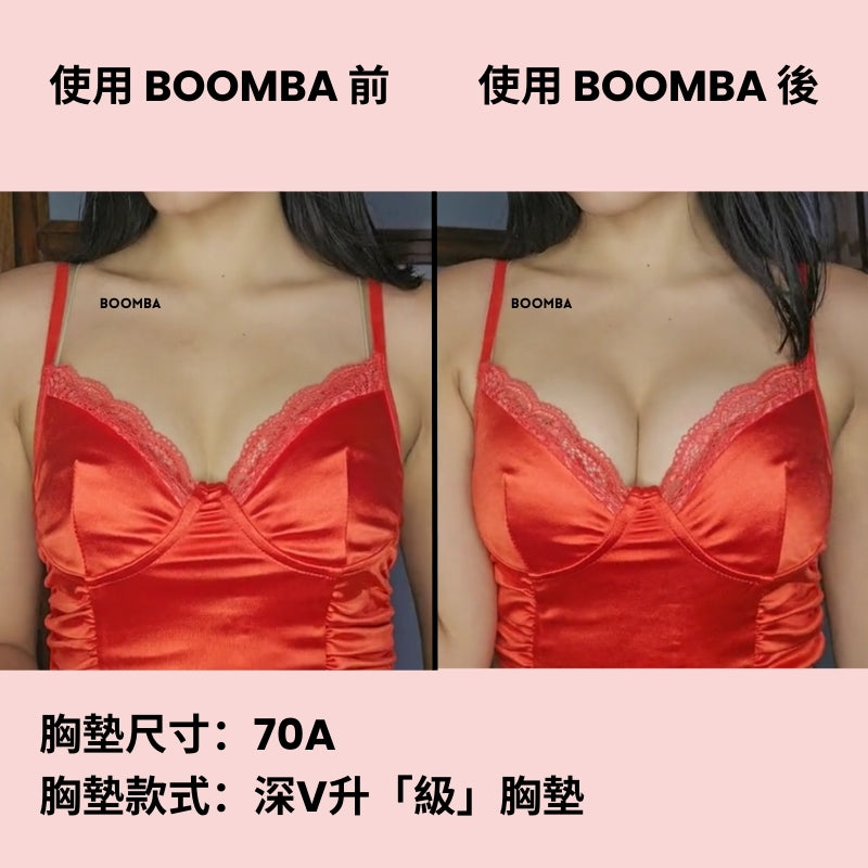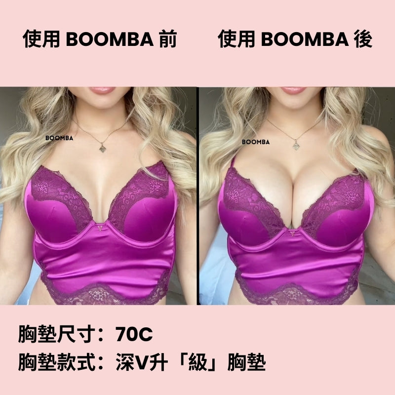 BOOMBA 胸墊有獨特專利設計,具備即時提拉效果,𣊬間提升 2 個 Cup Sizes!一著上身即刻打造完美乳溝!