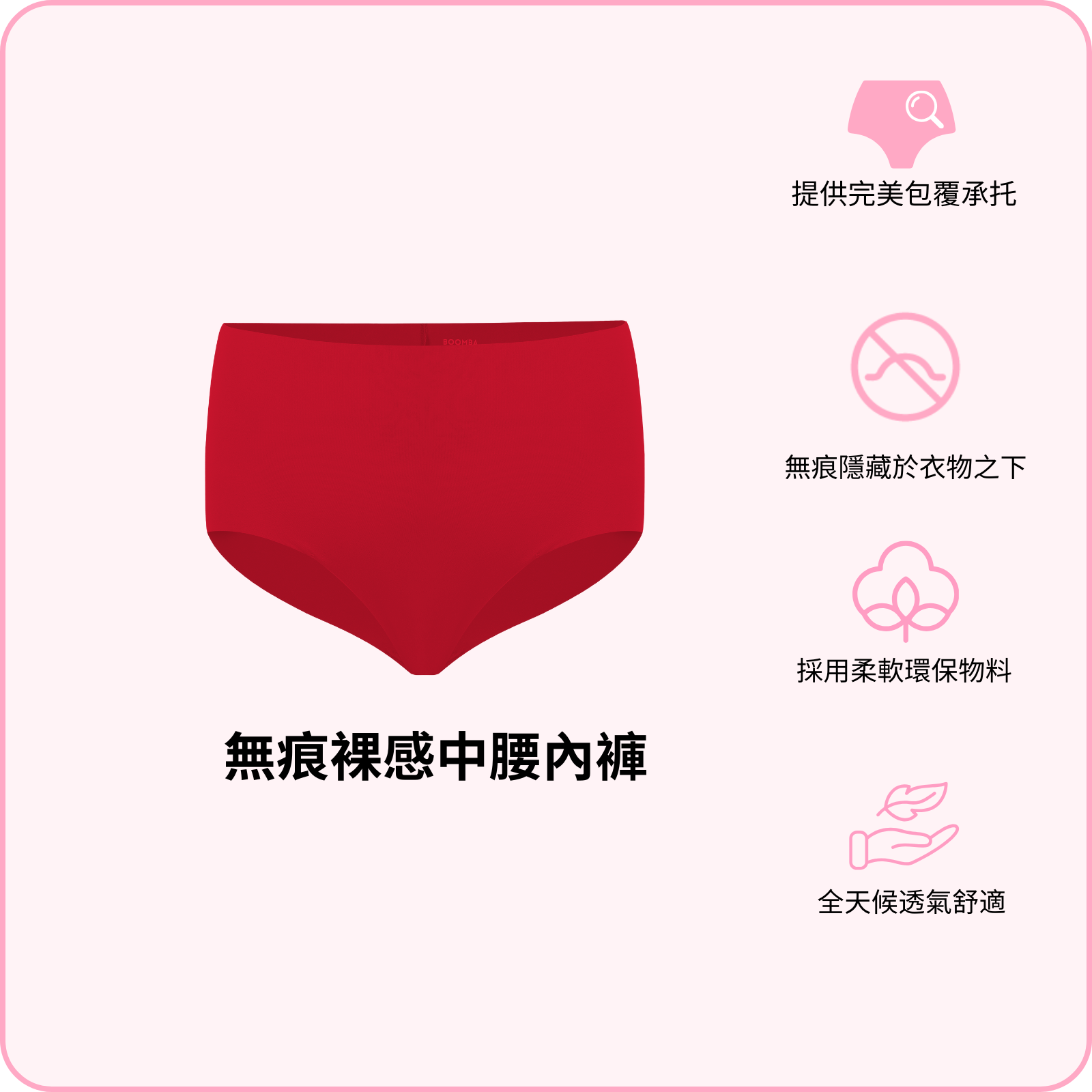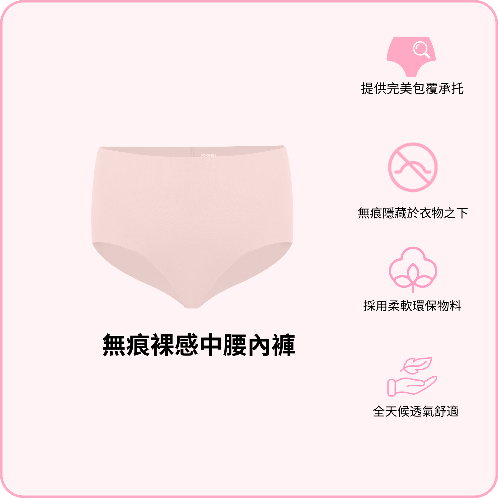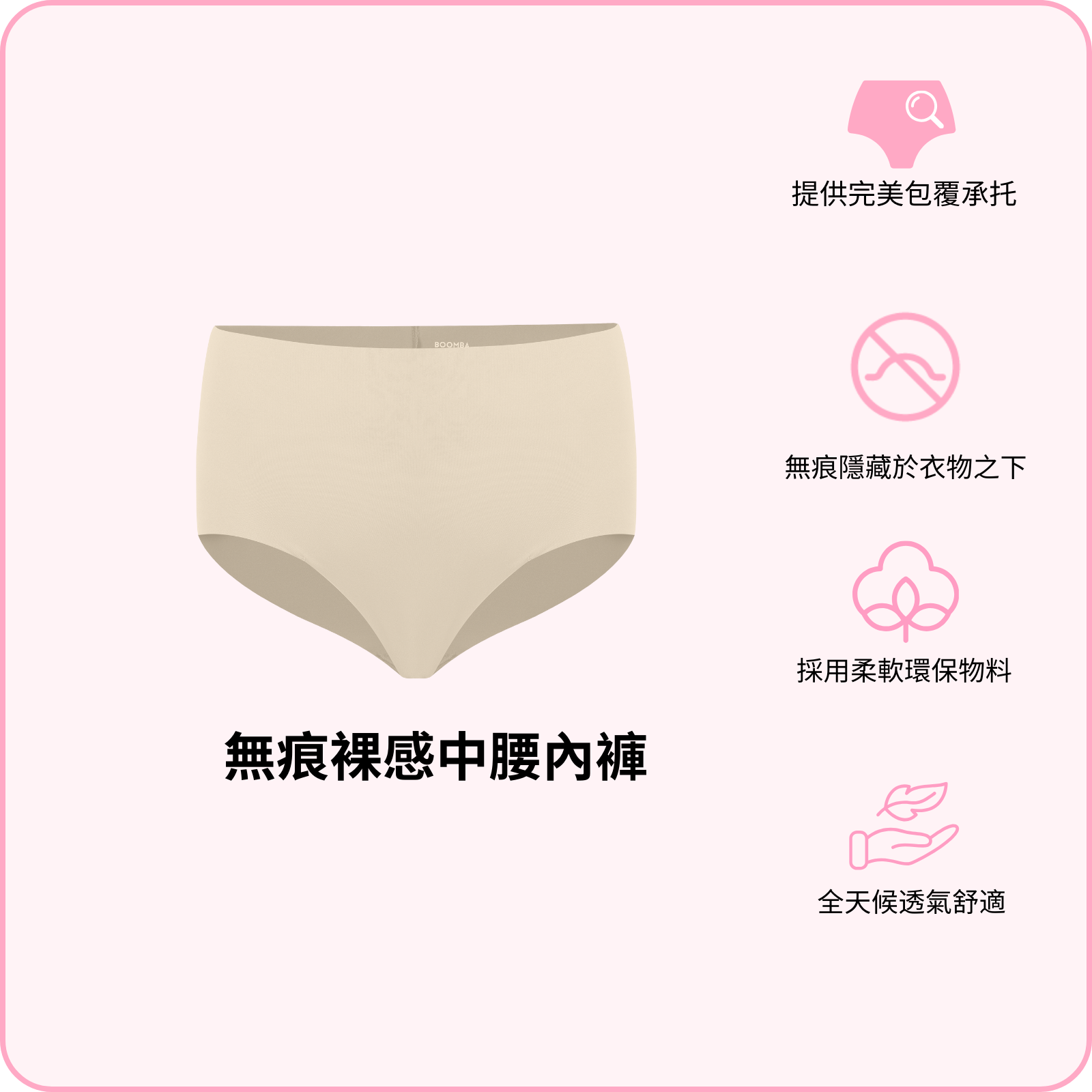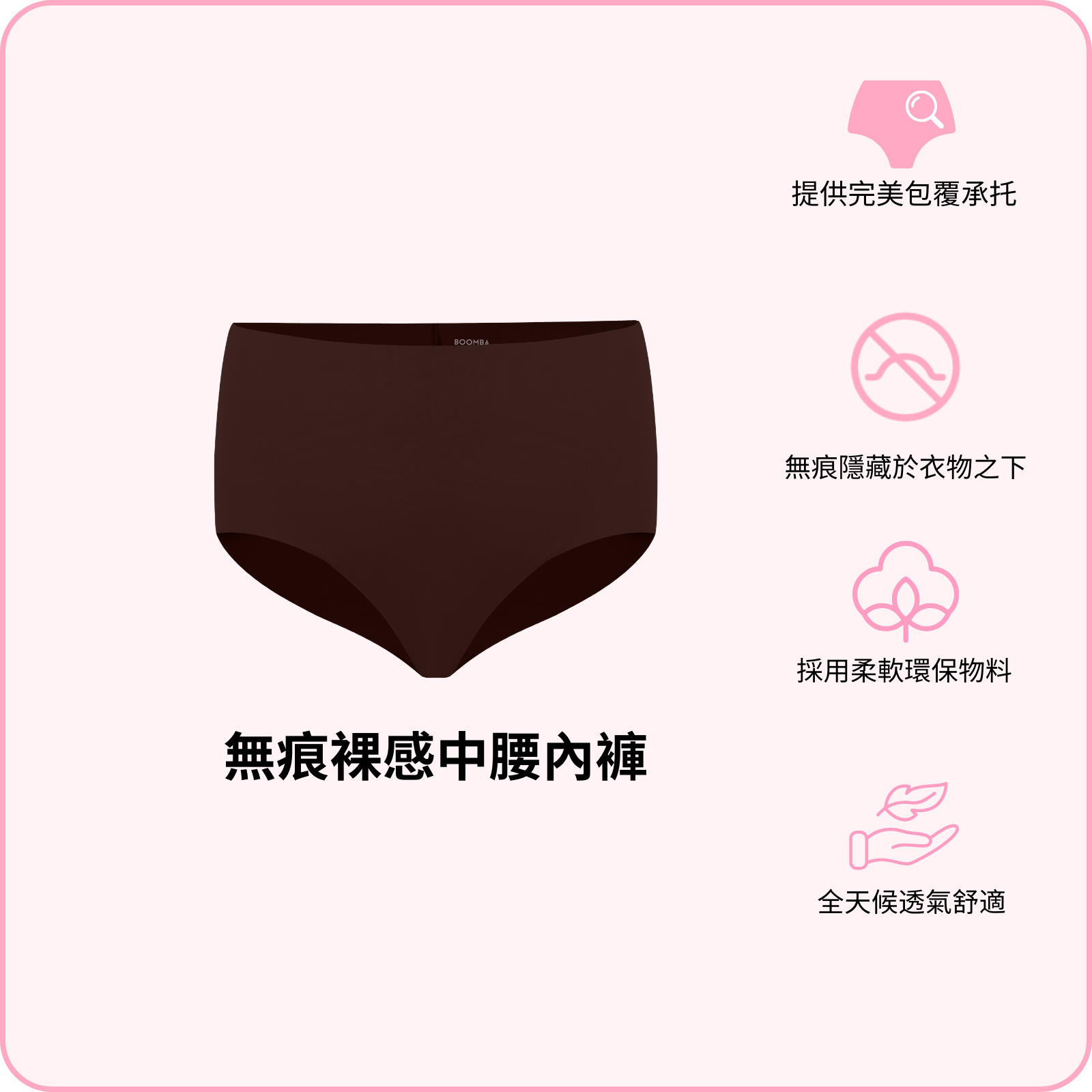 BOOMBA 無痕裸感中腰內褲柔軟貼身,好似溫柔擁抱你嘅翹臀咁舒服!超柔滑無痕布料,輕如無物嘅舒適感。中腰剪裁加包臀設計,完美修飾身形,無論喺屋企煲劇定係出街拍拖都啱著!換上呢條貼心內褲,全日都即刻充滿自信!