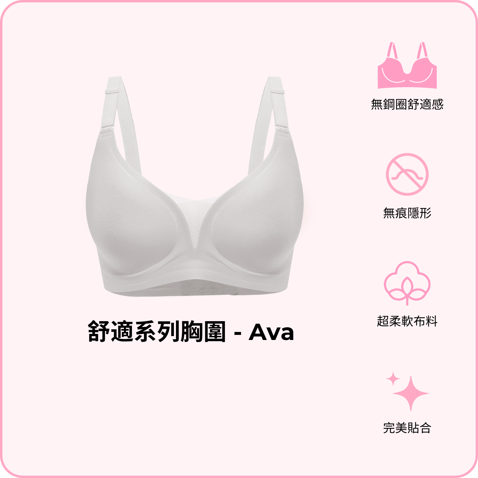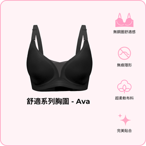 Ava —— 一款您真正需要嘅 bra。 無鋼圈刺痛、無需成日擰嚟擰去,俾到您柔軟承托,隨住您自由活動。布料觸感如絲般順滑,無痕Cups可以喺任何衫底下都保持平滑。