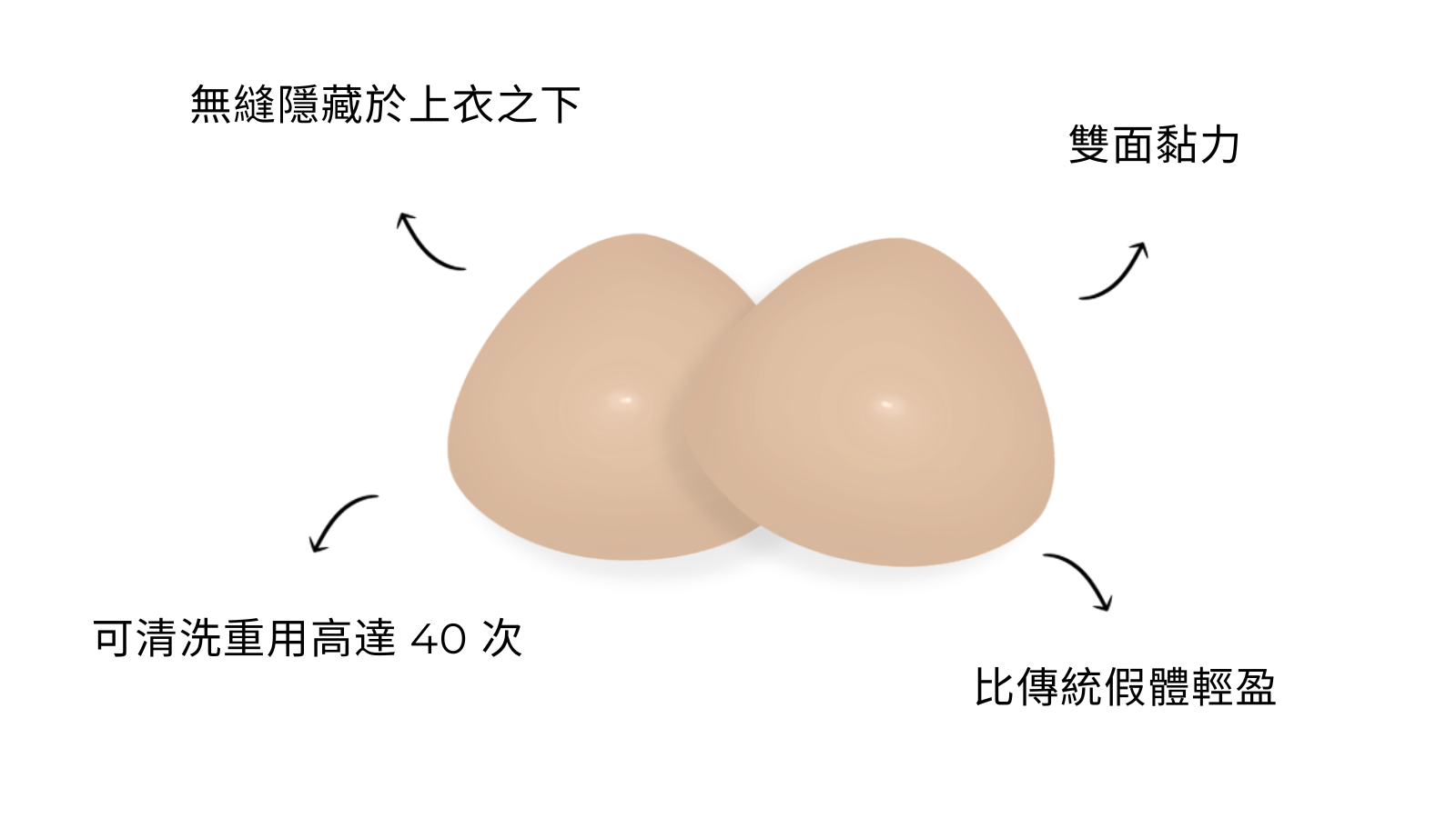 雙面黏力:義體胸墊雙面都有特強黏力,可以黏緊上衣同皮膚,適合全天候穿著。
