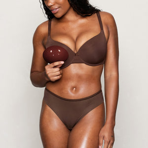 While scooping, press the insert onto the breasts and press firmly to secure.