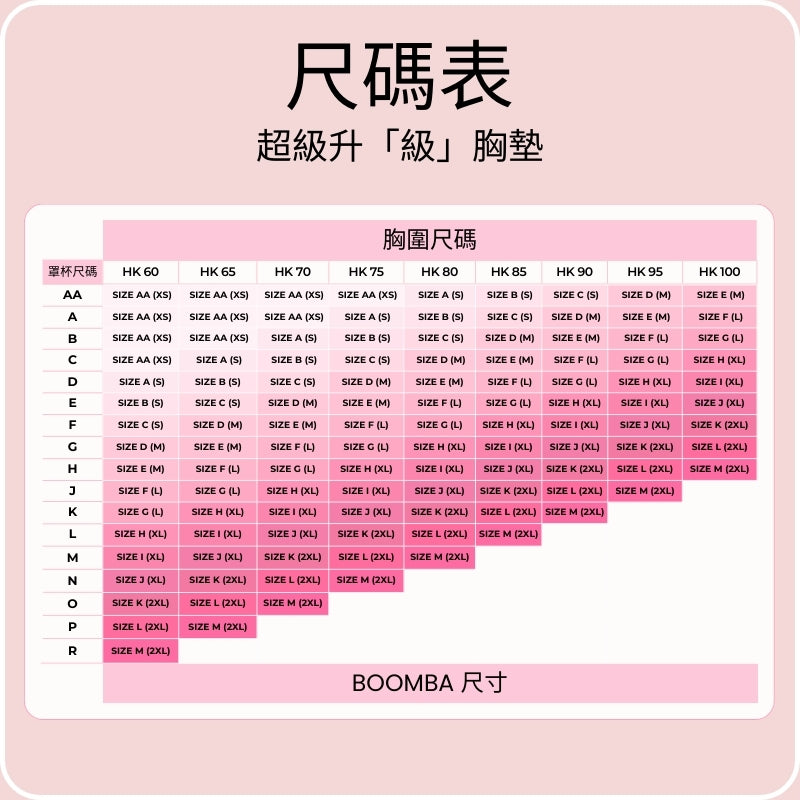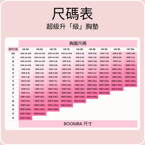 超級升「級」胸墊:AA Cup為加細碼,A、B、C Cup為細碼,D 和 E Cup為中碼,F 和 G Cup為大碼,H 、I、J Cup 為加大碼,K、L、M Cup為加加大碼 。
