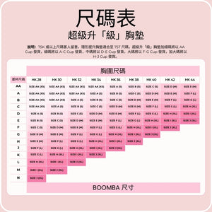 超級升「級」胸墊:AA Cup為加細碼,A、B、C Cup為細碼,D 和 E Cup為中碼,F 和 G Cup為大碼,H 、I、J Cup 為加大碼,K、L、M Cup為加加大碼 。