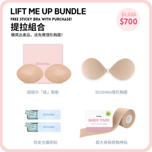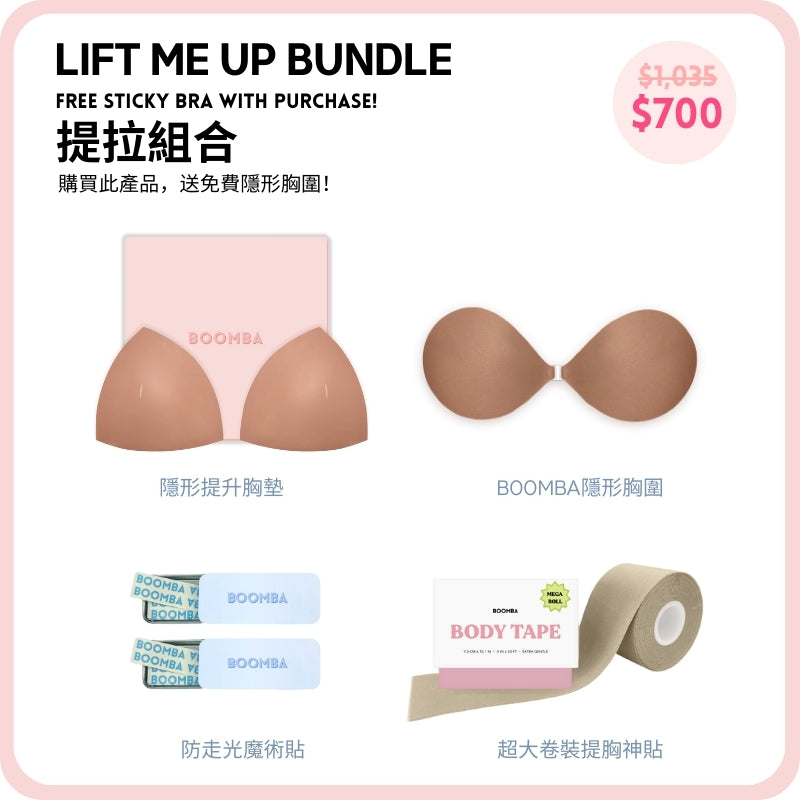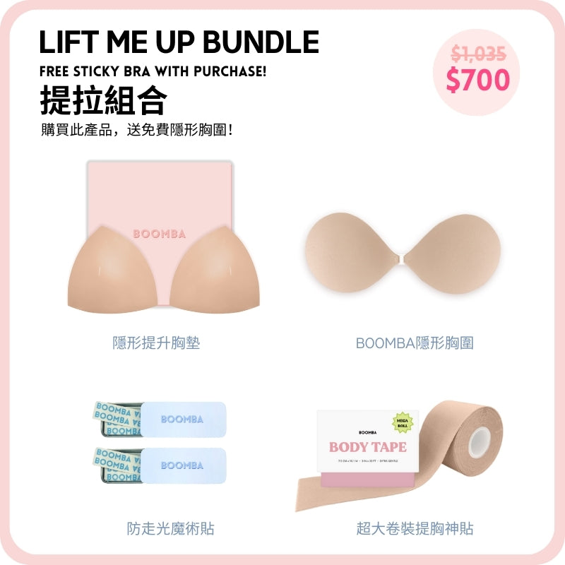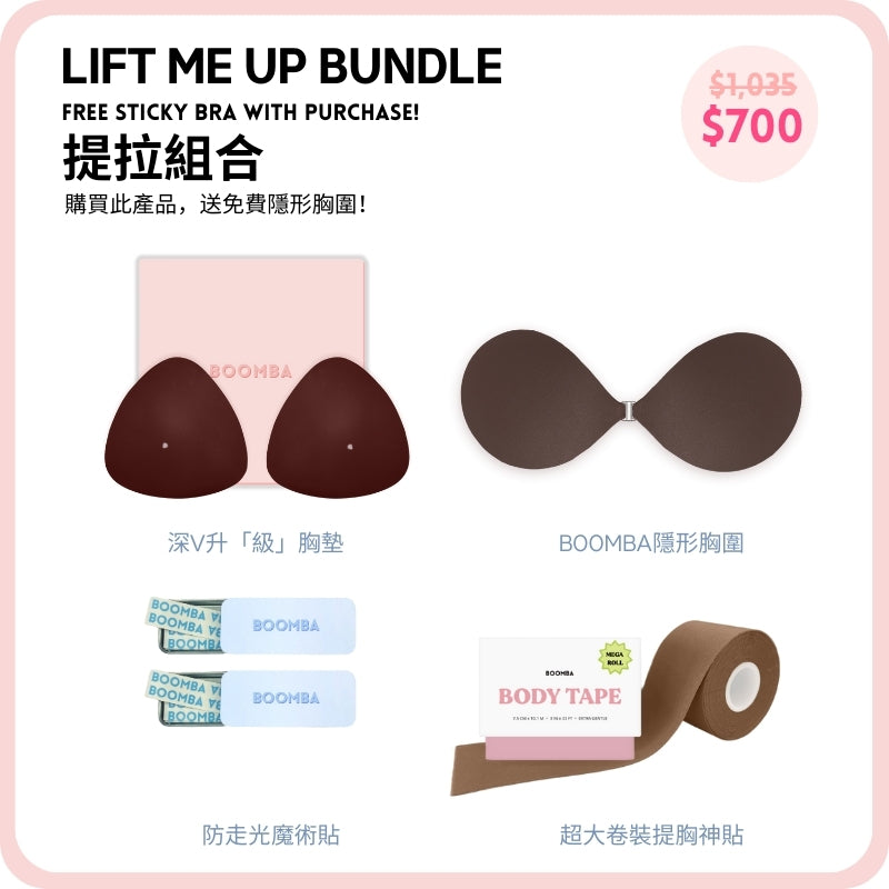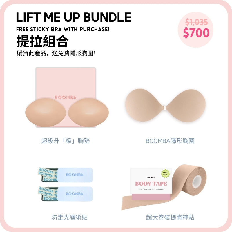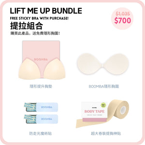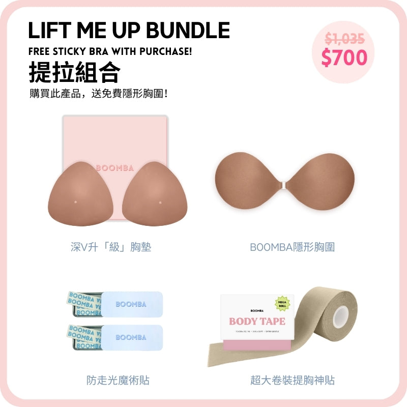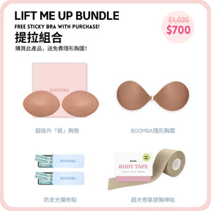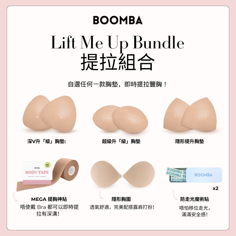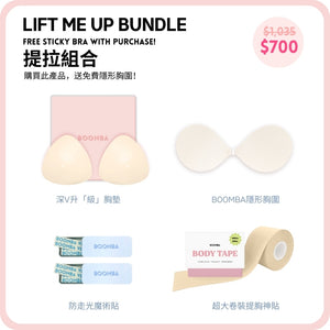 請注意,成效因乳房大小和形狀而異,效果將類似於雙重提升胸圍。 BOOMBA 胸墊最適合用於天然乳房。