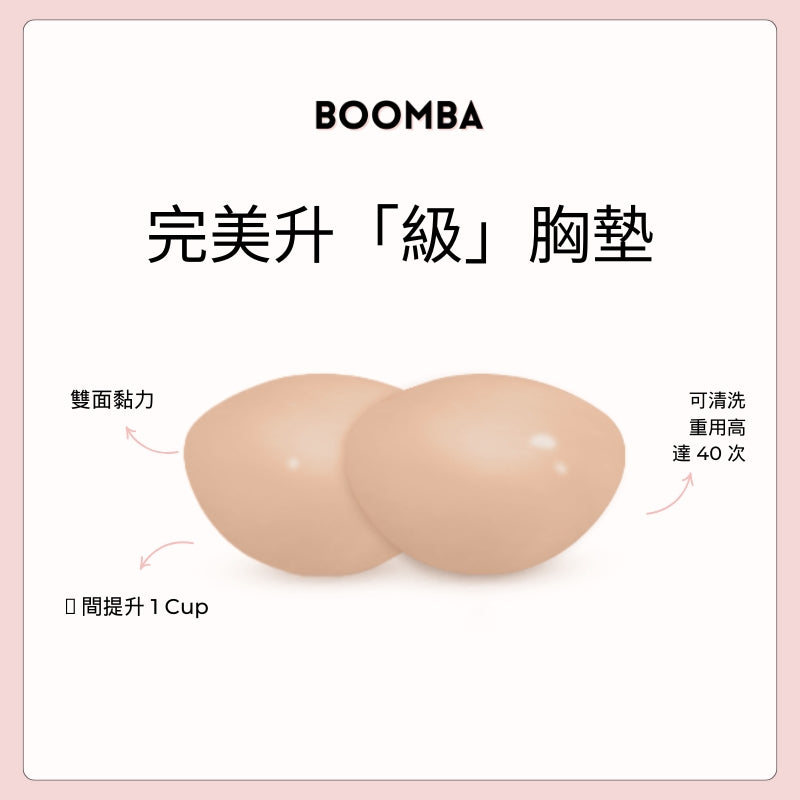 請注意,成效因乳房大小和形狀而異,效果將類似於雙重提升胸圍。 BOOMBA 胸墊最適合用於天然乳房。