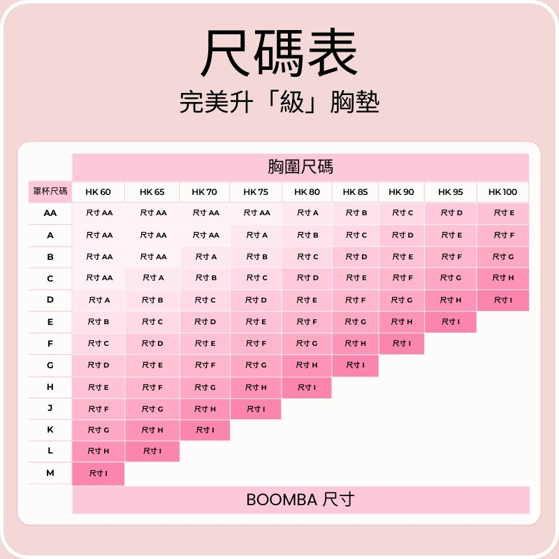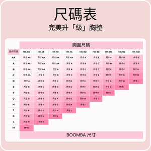 對於 75J 或以上尺寸,BOOMBA 超級升「級」胸墊(雙 Push Up)尺寸可達 75N;隱形提升胸墊(薄墊)尺寸可達 75T。