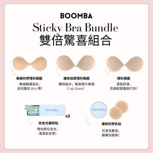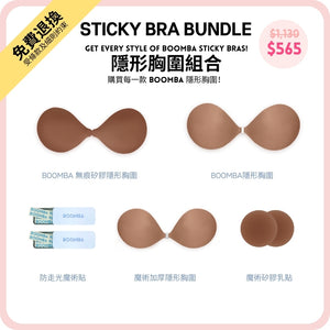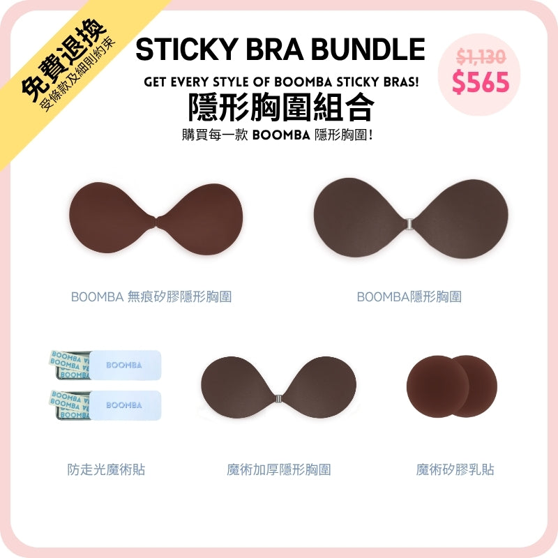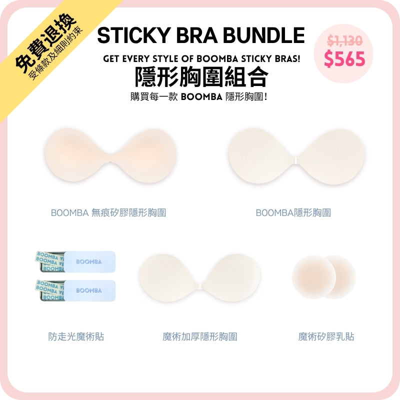 為任何造型做好準備!呢款 BOOMBA 組合包括我哋最暢銷嘅無痕矽膠隱形胸圍、隱形胸圍同全新推出嘅魔術加厚隱形胸圍,仲有我哋皇牌魔術矽膠乳貼,以及2 盒防走光膠紙,一套搞掂你所有造型需要!