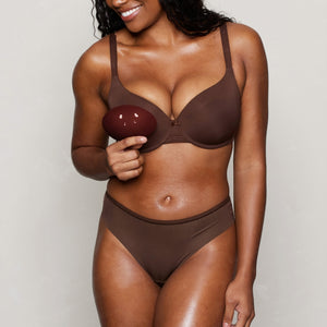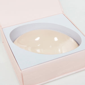 While scooping, press the insert onto the breasts and press firmly to secure.