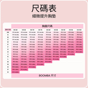 細微提升胸墊:AA Cup為加細碼,A、B、C Cup為細碼,D 和 E Cup為中碼,F 和 G Cup為大碼,H 、I、J Cup 為加大碼,K、L、M Cup為加加大碼 。