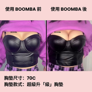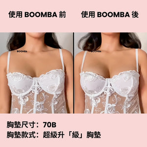 請注意,成效因乳房大小和形狀而異,效果將類似於雙重提升胸圍。 BOOMBA 胸墊最適合用於天然乳房。