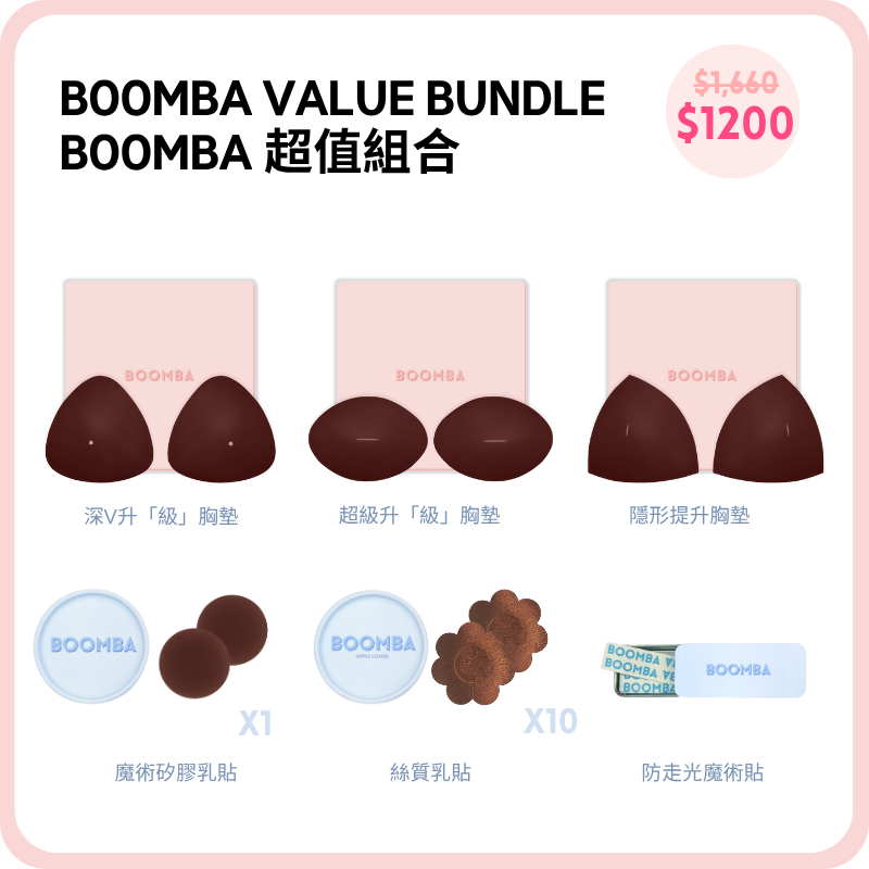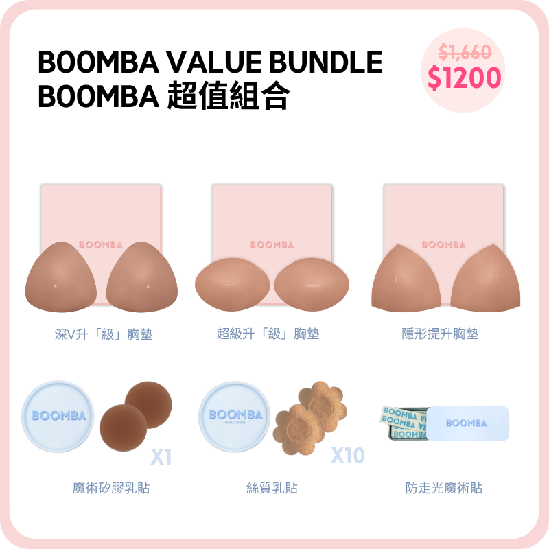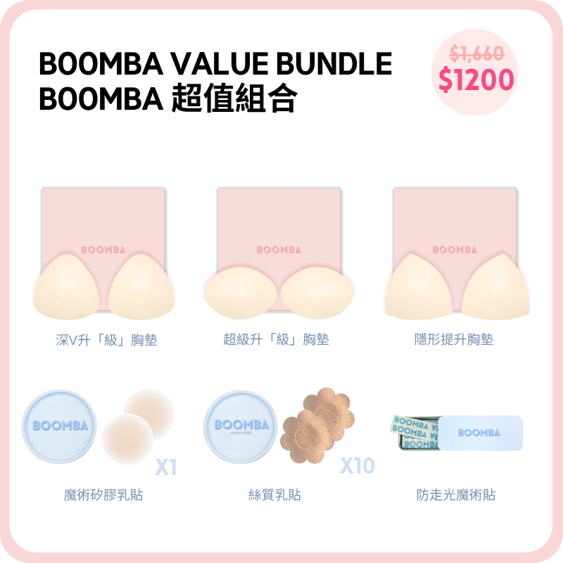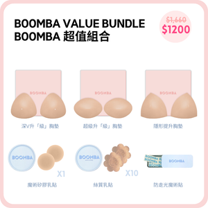 BOOMBA 胸墊同一般由黏合劑支撐嘅隱形胸圍唔同,必須配合貼身、有結構嘅上衣先有最佳效果。產品本身無法獨立支撐。