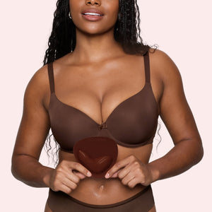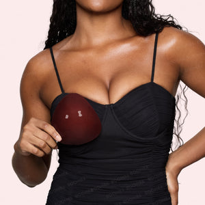 While scooping, press the insert onto the breasts and press firmly to secure.